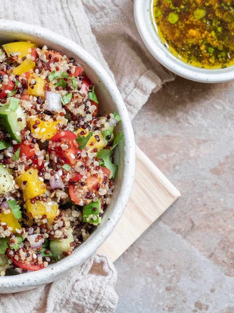 A quinoát alaposan öblítsd át hideg vízzel, kb. 500 ml vízben forrald fel, tedd hozzá a VegaNatura ételízesítőt, majd lefedve, alacsony lángon főzd 12–15 percig. Amikor a szemek megpuhultak és a csírák láthatóvá válnak, vedd le a tűzről, hagyd lefedve 5 percig pihenni, majd villával lazítsd fel. Hűtsd ki teljesen. - Zöldségek előkészítése:
